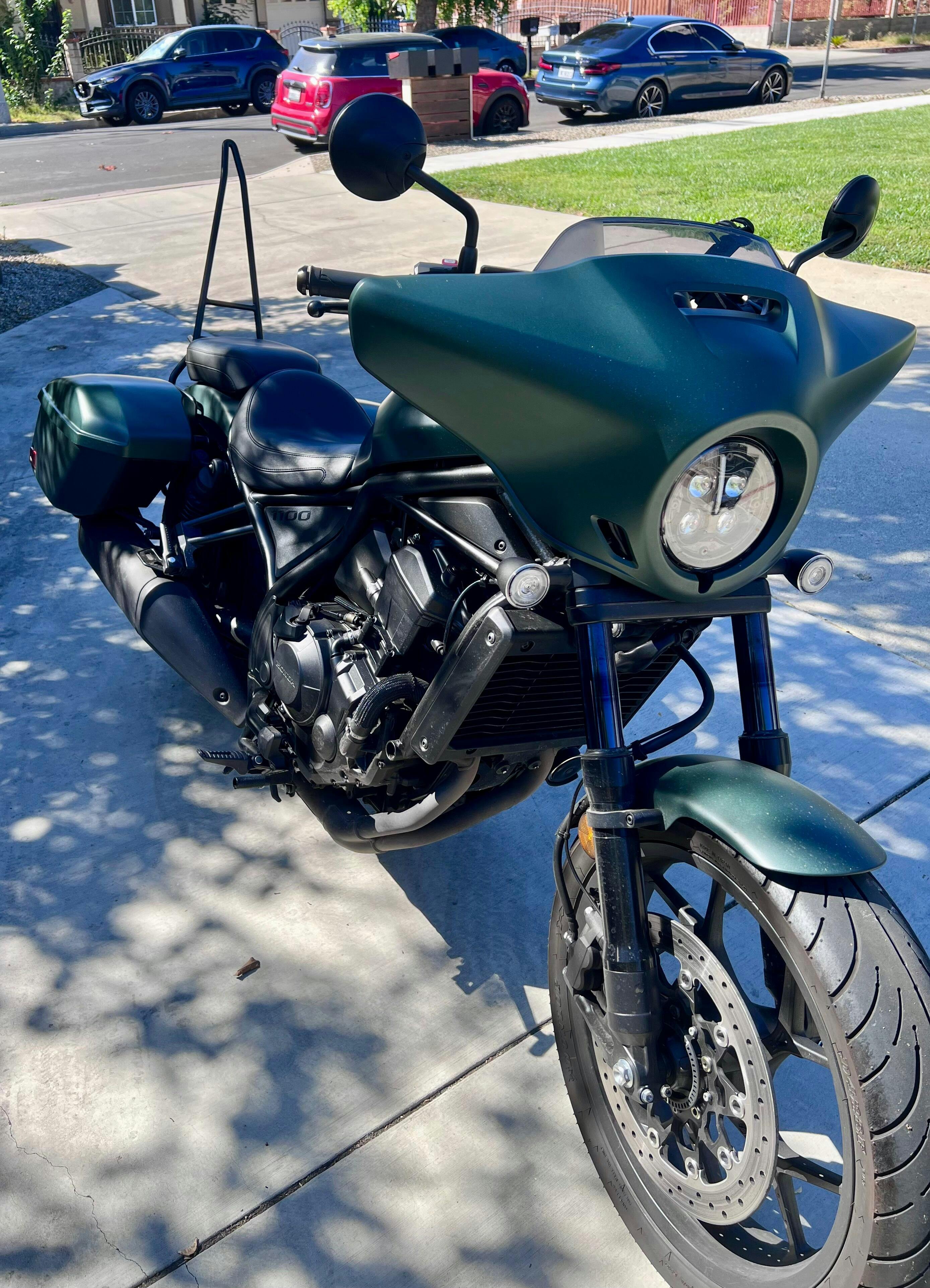 It bolts outside the struts of 2016 and up Honda Rebel models and comes with required hardware.